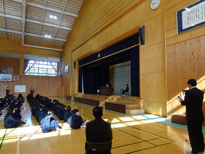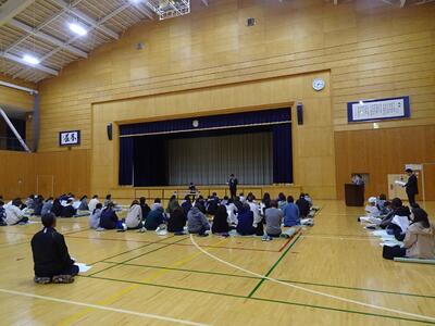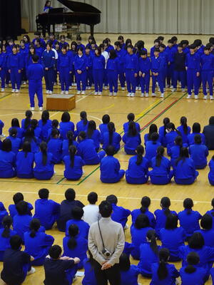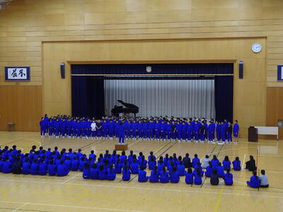 特に、3年生のS君が語った、「ふるさとを離れて寮生活をすることはさみしいが、自分の決めた道を信じて進みたい。そして、充実していた中学校3年間以上に、嫌になるぐらい忙しく充実した日々を過ごしたい。そして、常に手を抜いて生きていないか、自分に問い続けたい」とのことばには、校歌に歌われている「水豊かなる天竜」の「止まぬ姿」や「青空高き連峰」の「動がぬさま」そのものを感じました。