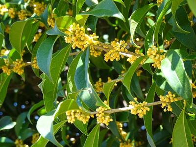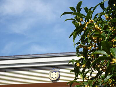 学校の敷地に植わっている、高森町の木「キンモクセイ」がようやく花を咲かせ、秋を感じさせる薫りを放っています。