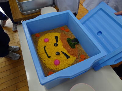 3月13日(金)の給食では、高森町学校給食センターの皆さんから、卒業する3年生へサプライズの「卒業記念プレゼント」が贈られました。3年生の各教室からは、ご飯が収められたお櫃の蓋が開けられると、拍手と歓声があがりました。(高森町のマスコットキャラクターである「柿丸くん」が、色とりどりの具材できれいに、かわいらしくご飯の上に描かれていました。)