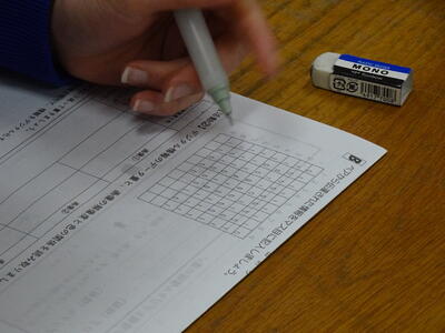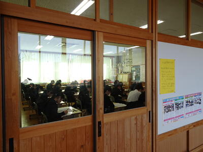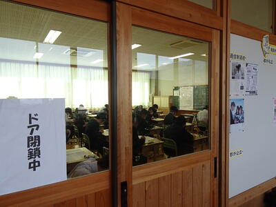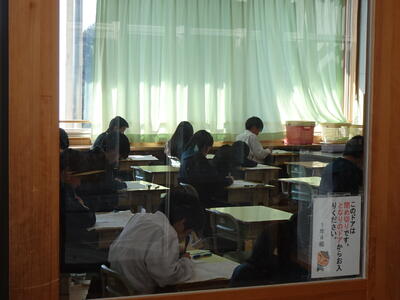 この日は、公立高校後期入学者選抜(学力検査)時と同じ検査教科の順番、問題・答案用紙の配付の仕方、各教室の時計も隠した状態での試験実施でした。