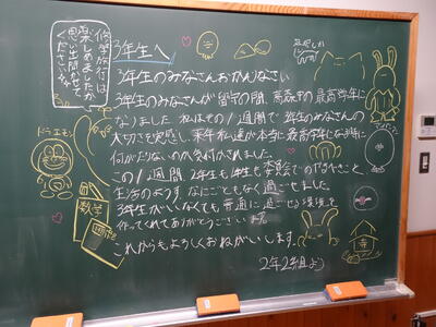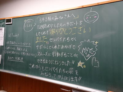 4月17日放課後、3年生の各クラスの黒板には、1、2年生の姉妹学級の学級長会のメンバーからのメッセージが書かれていました。3年生の学級長会のメンバーが、修学旅行前に1、2年生の姉妹学級の黒板に記した「修学旅行中の学校を頼む!」のメッセージへの「返信」でした。