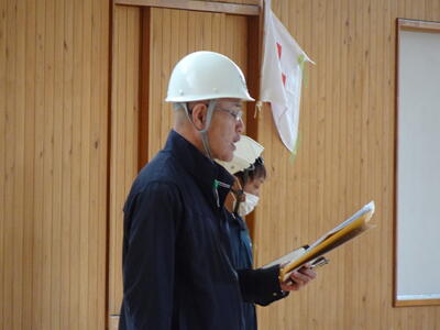 飯野校長からは、今回の訓練態度のすばらしさを評価することばと、自宅にいる時間帯に災害に遭遇した際、自分の身を守ることはもちろんのこと、地域に暮らす弱い立場にある人たちへの支援にも協力できる高森中生であってほしい旨の話がありました。